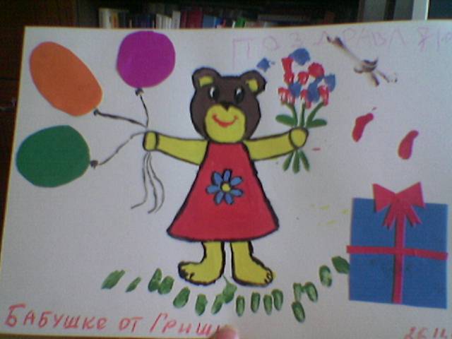 Гриша рисовал цветы, травку, клеил подарок и шарики, писал надпись с